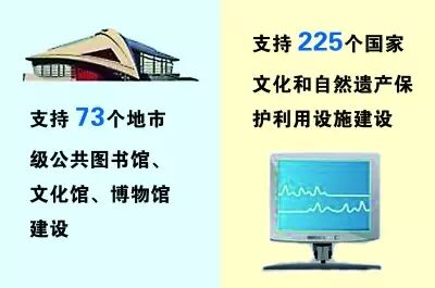 扩大公共服务供给:公共文化服务体系建设继续加强。实施中华优秀传统文化传承发展工程的意见等基础性制度出台。支持73个地市级公共图书馆、文化馆、博物馆建设,225个国家文化和自然遗产保护利用设施建设。